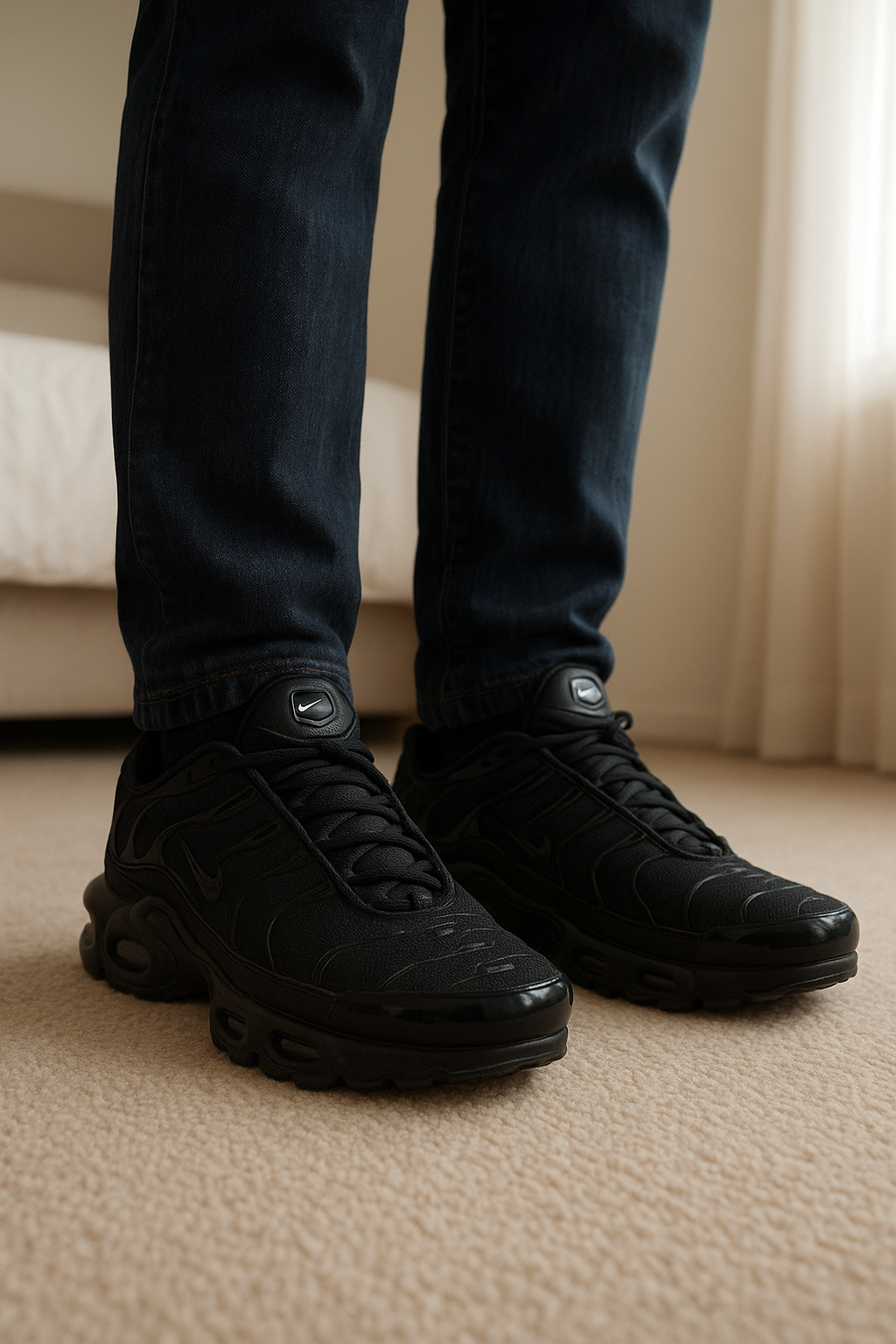 Chaussures TN debout, face à la caméra, dans une chambre à la lumière douce, avec une lumière naturelle filtrant par la fenêtre.