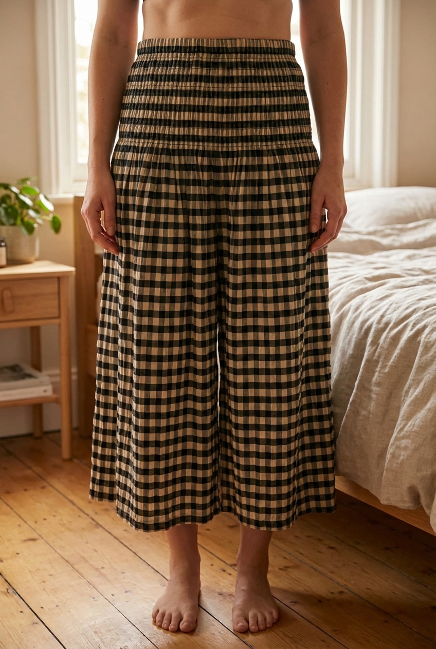 Check skirt standing straight facing the camera, in a softly lit bedroom setting, with gentle natural light filtering through a window.