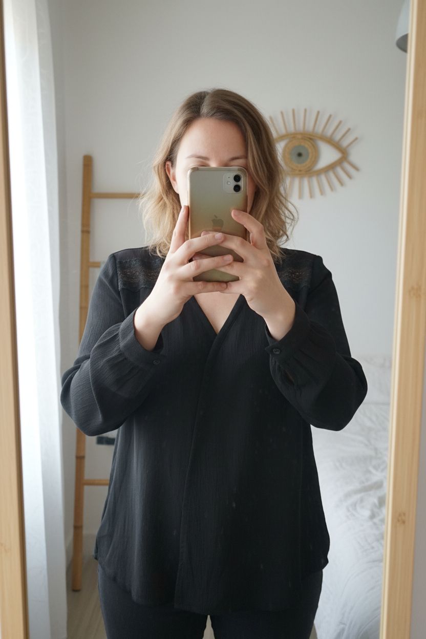 Une personne en Cheminer noir Etam debout, face à la caméra, avec une silhouette légèrement plus ronde, dans une chambre à la lumière douce, avec une lumière naturelle filtrant par la fenêtre.