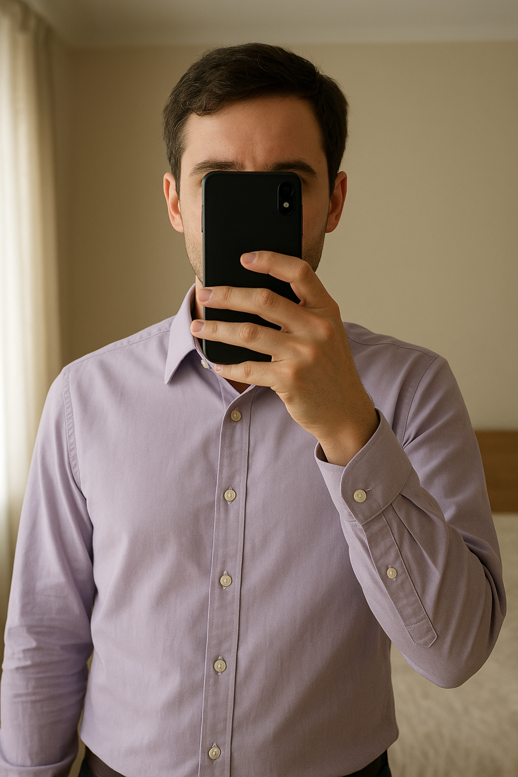 Chemise debout, face à la caméra, dans une chambre à la lumière douce, avec une lumière naturelle filtrant par la fenêtre.