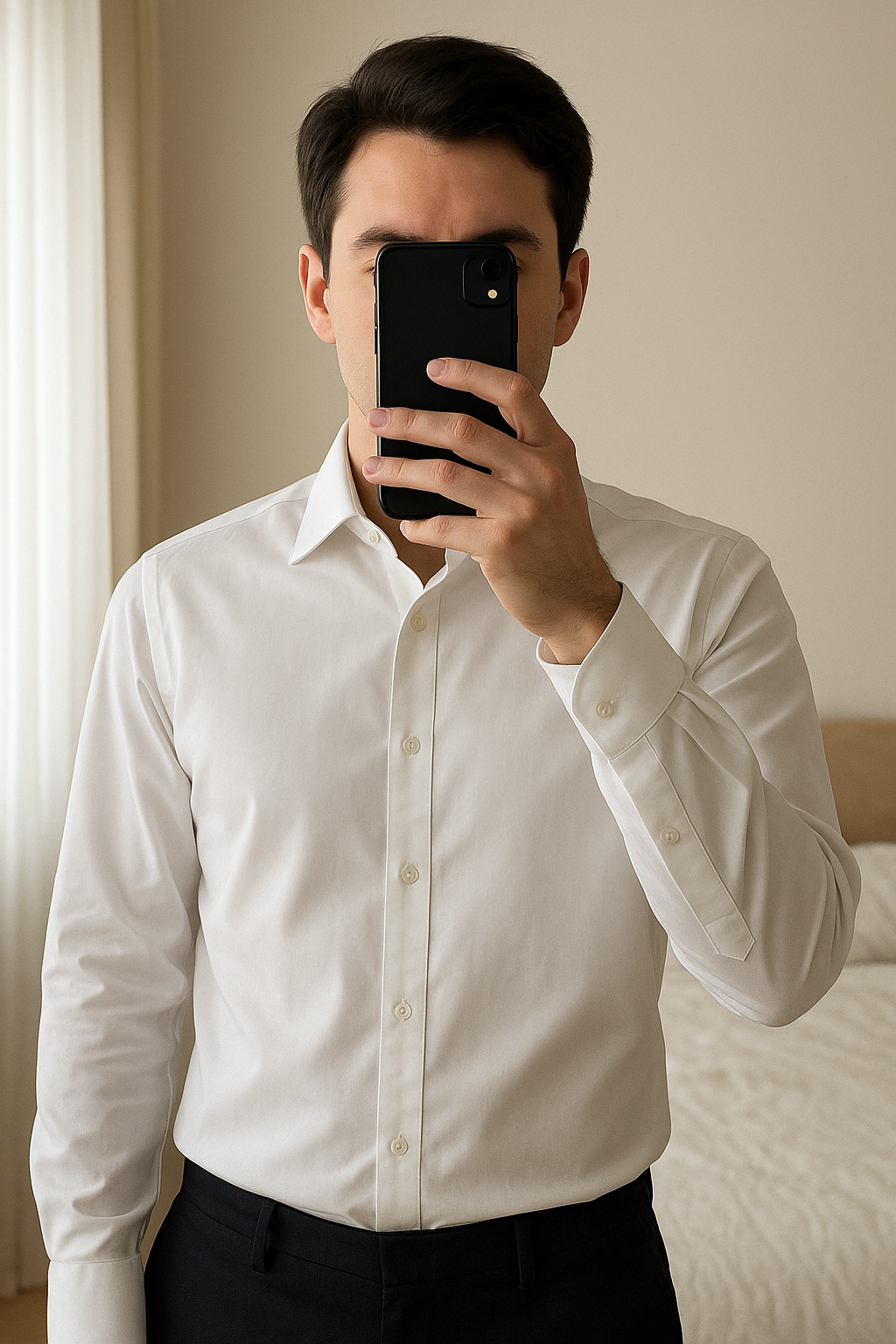 Chemise debout, face à la caméra, dans une chambre à la lumière douce, avec une lumière naturelle filtrant par la fenêtre.