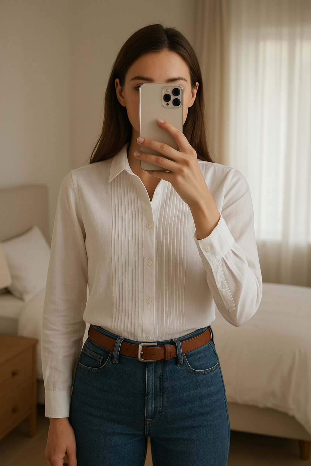 🌸Chemise blanche Polo Ralph Lauren🌸 debout, face à la caméra, dans une chambre à la lumière douce, avec une lumière naturelle filtrant par la fenêtre.