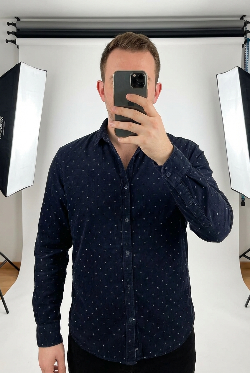 Une personne en Chemise bleu marine motifs blancs, effet velours côtelé très doux au toucher, 100% coton - Taille L debout, face à la caméra, avec une silhouette légèrement plus ronde, dans un studio photo épuré avec fond blanc et éclairage doux.