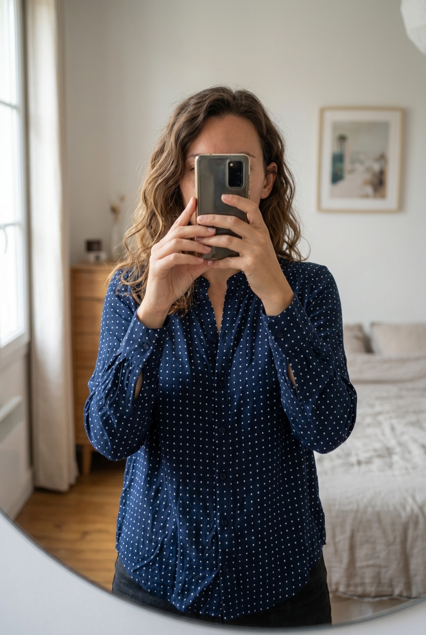 Une personne en Chemise bleu marine zara debout, face à la caméra, dans une chambre à la lumière douce, avec une lumière naturelle filtrant par la fenêtre.