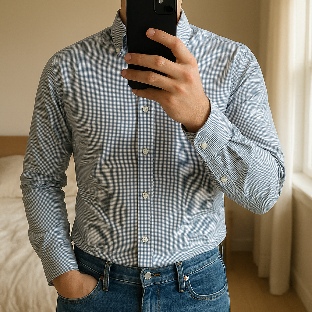 Chemise à Carreaux Homme de Ton Bleu et Blanc - Taille M - CELIO debout, face à la caméra, dans une chambre à la lumière douce, avec une lumière naturelle filtrant par la fenêtre.
