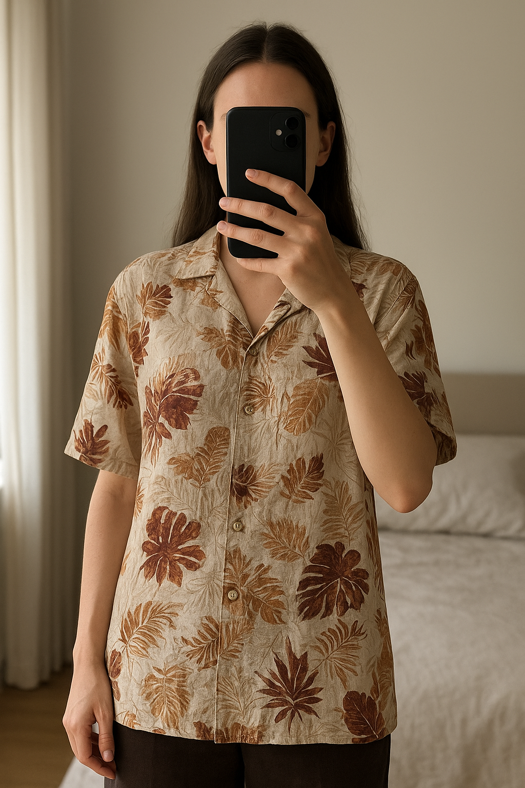 Chemise d'été debout, face à la caméra, dans une chambre à la lumière douce, avec une lumière naturelle filtrant par la fenêtre.