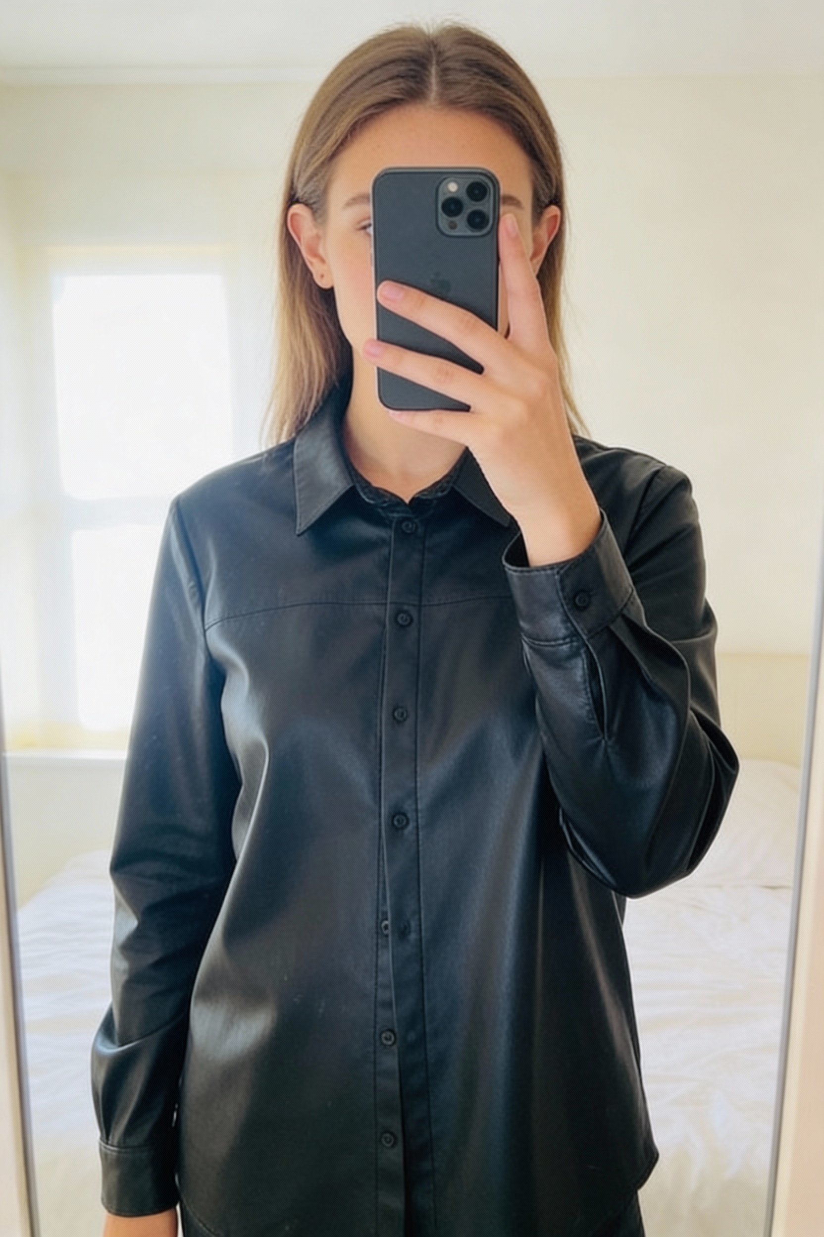 Chemise en simili cuir Street one taille 40 oversize debout, face à la caméra, dans une chambre à la lumière douce, avec une lumière naturelle filtrant par la fenêtre.