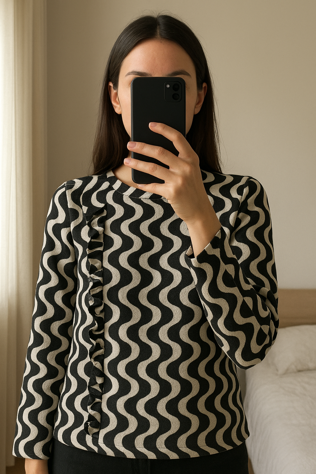 Chemise femme debout, face à la caméra, dans une chambre à la lumière douce, avec une lumière naturelle filtrant par la fenêtre.