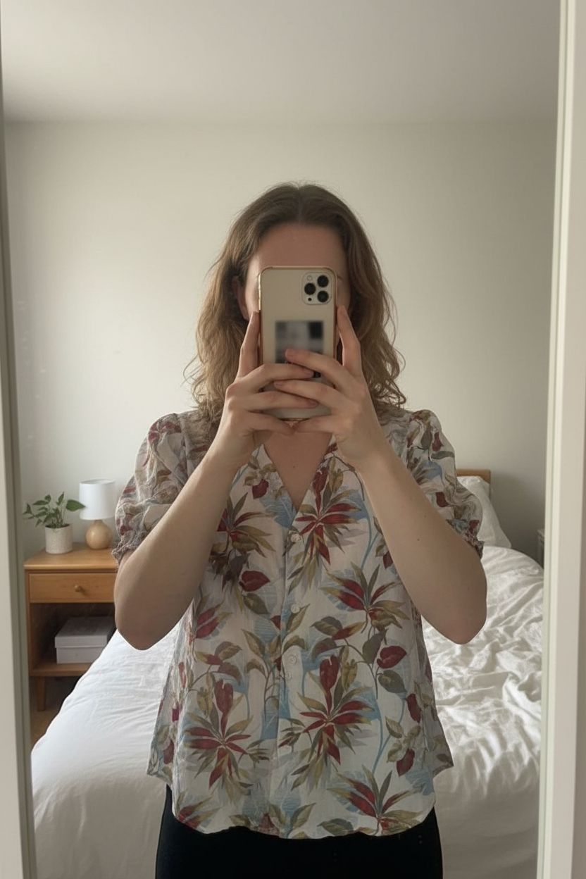 Chemise femme season taille s debout, face à la caméra, dans une chambre à la lumière douce, avec une lumière naturelle filtrant par la fenêtre.