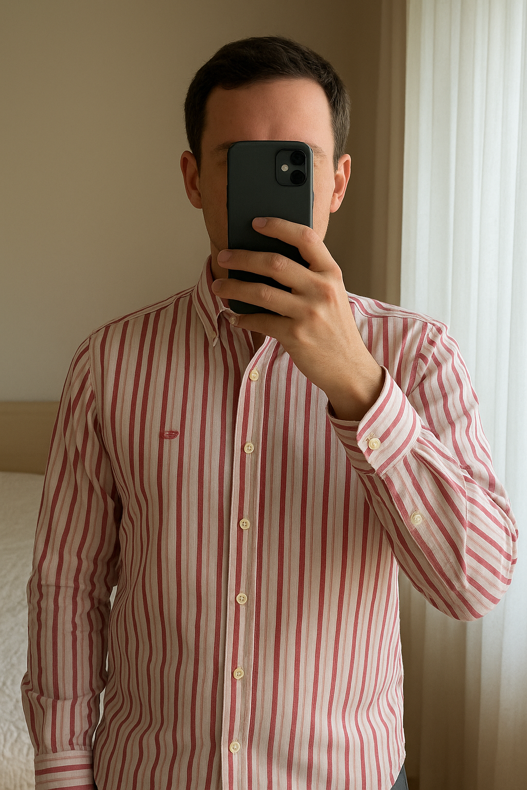 Chemise Harmont & Blaine à rayure taille L debout, face à la caméra, dans une chambre à la lumière douce, avec une lumière naturelle filtrant par la fenêtre.