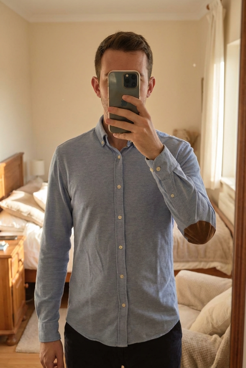 Chemise homme zara debout, face à la caméra, dans une chambre à la lumière douce, avec une lumière naturelle filtrant par la fenêtre.
