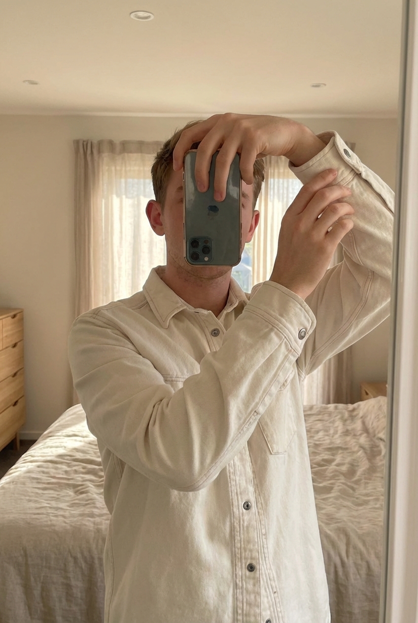 Chemise jean diesel S debout, face à la caméra, dans une chambre à la lumière douce, avec une lumière naturelle filtrant par la fenêtre.
