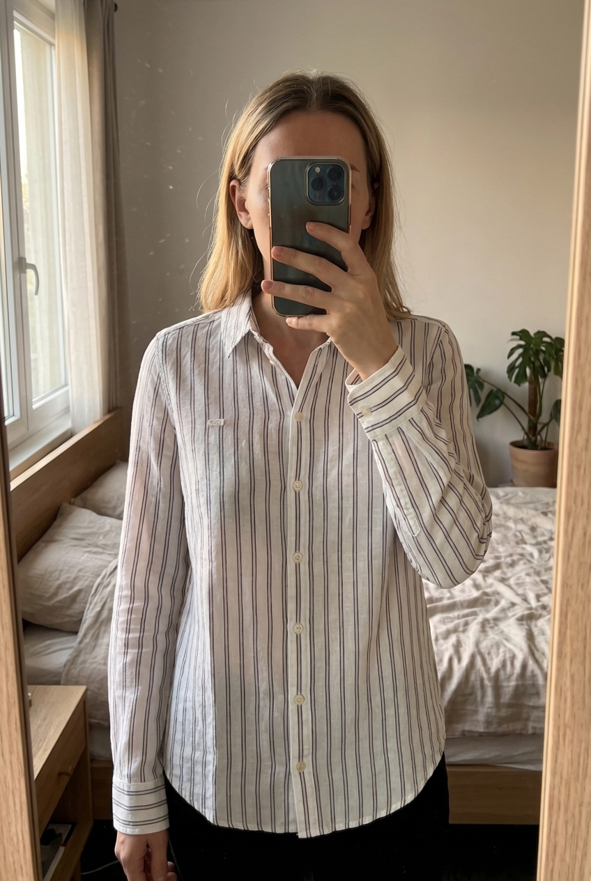Chemise levi’s à rayures S debout, face à la caméra, dans une chambre à la lumière douce, avec une lumière naturelle filtrant par la fenêtre.