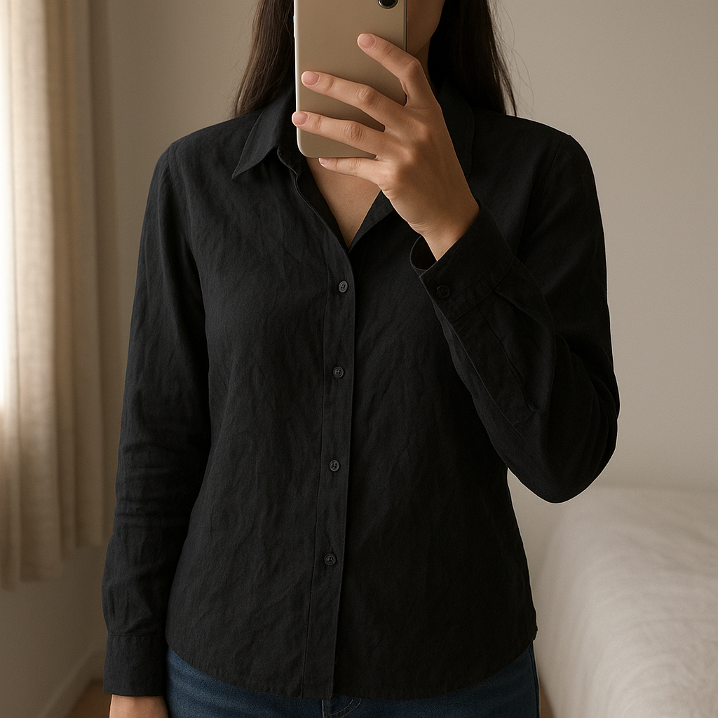 Chemise Naf Naf noire taille 38 debout, face à la caméra, dans une chambre à la lumière douce, avec une lumière naturelle filtrant par la fenêtre.