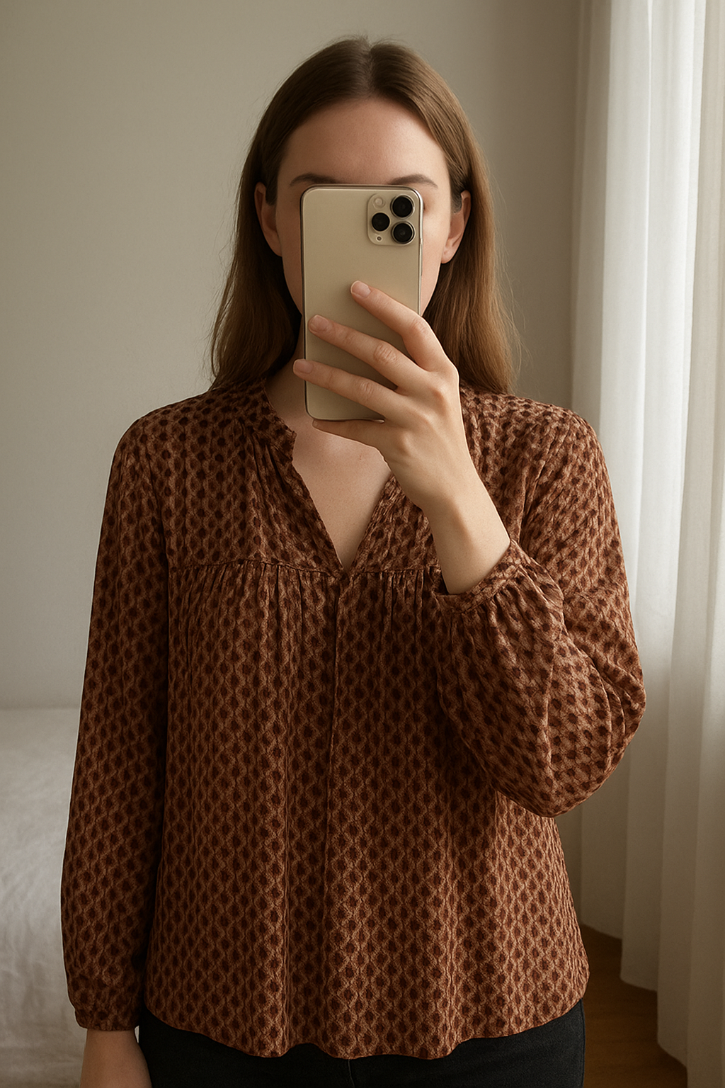 Chemise, Pablo debout, face à la caméra, dans une chambre à la lumière douce, avec une lumière naturelle filtrant par la fenêtre.