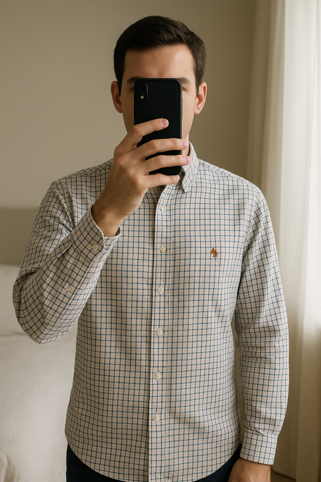 Une personne en Chemise Ralph Lauren debout, face à la caméra, dans une chambre à la lumière douce, avec une lumière naturelle filtrant par la fenêtre.