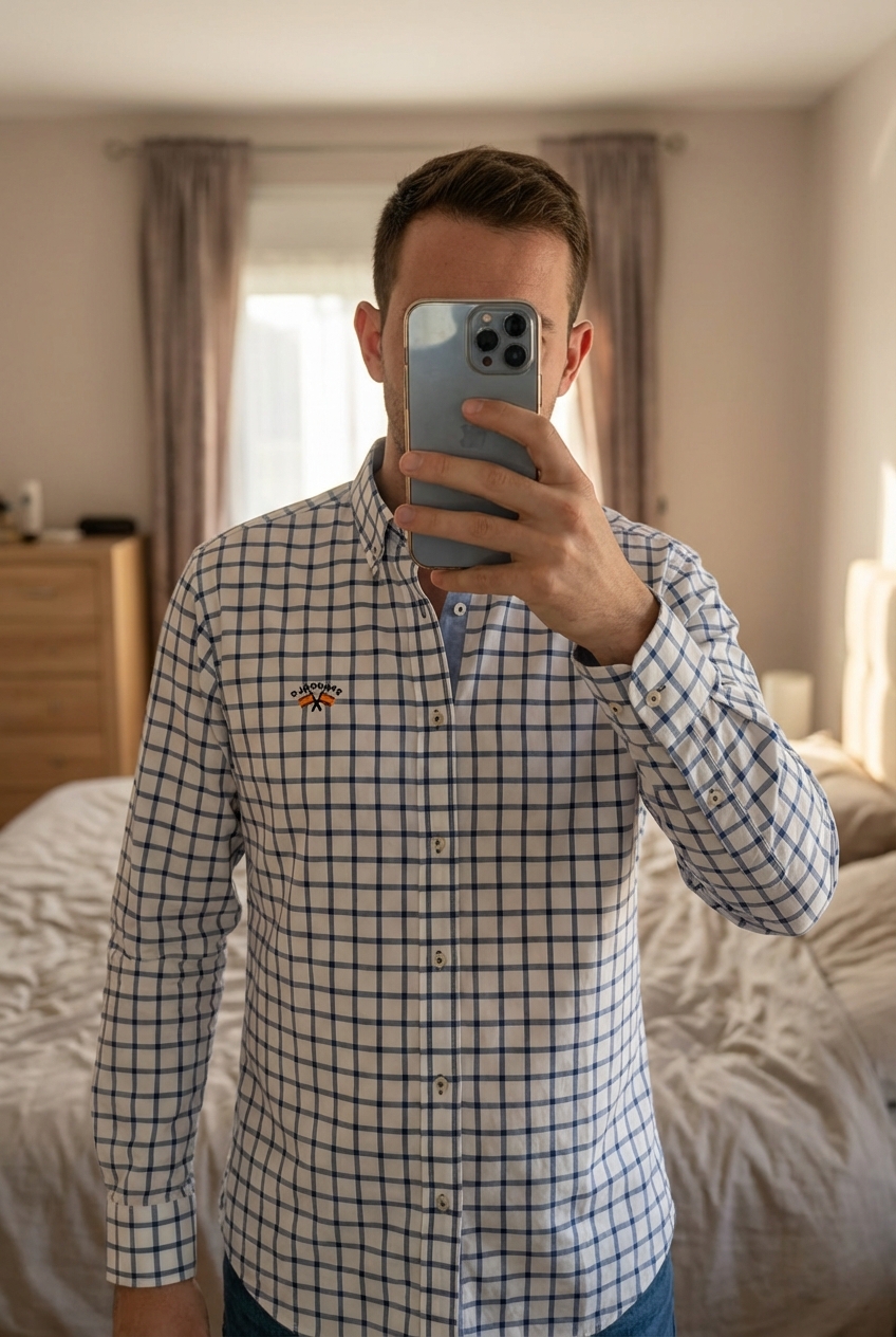 Chemise Spagnolo neuf debout, face à la caméra, dans une chambre à la lumière douce, avec une lumière naturelle filtrant par la fenêtre.