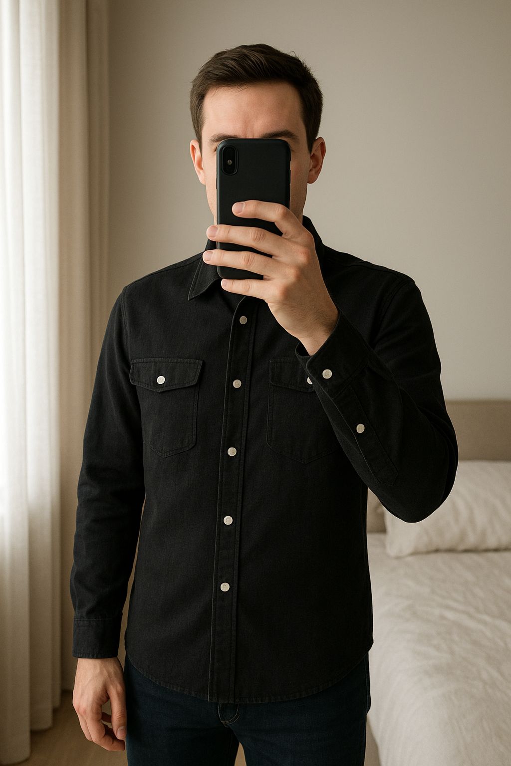 Chemise Timberland homme taille S debout, face à la caméra, dans une chambre à la lumière douce, avec une lumière naturelle filtrant par la fenêtre.