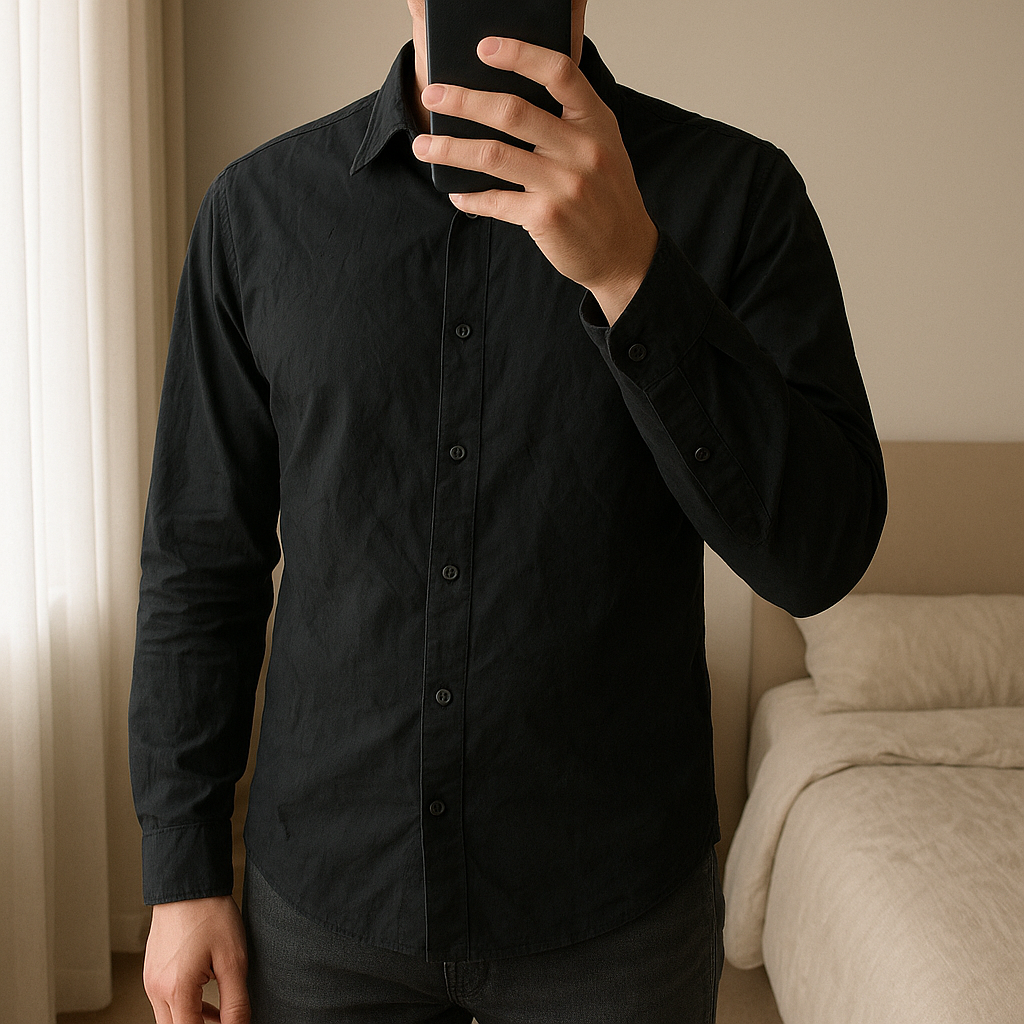 Chemise Unie Taille M Homme debout, face à la caméra, dans une chambre à la lumière douce, avec une lumière naturelle filtrant par la fenêtre.