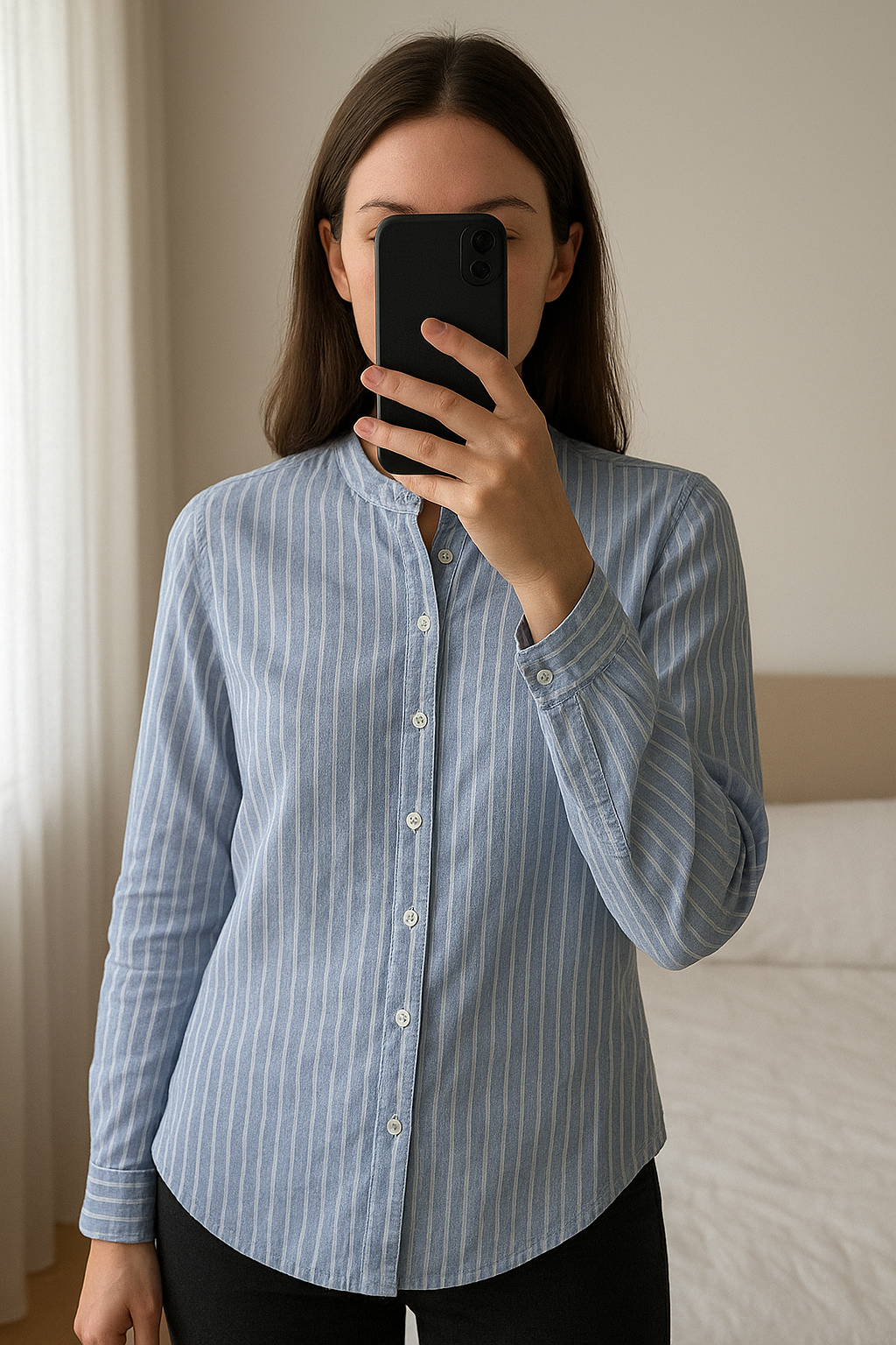 Chemise Zara Basic debout, face à la caméra, dans une chambre à la lumière douce, avec une lumière naturelle filtrant par la fenêtre.