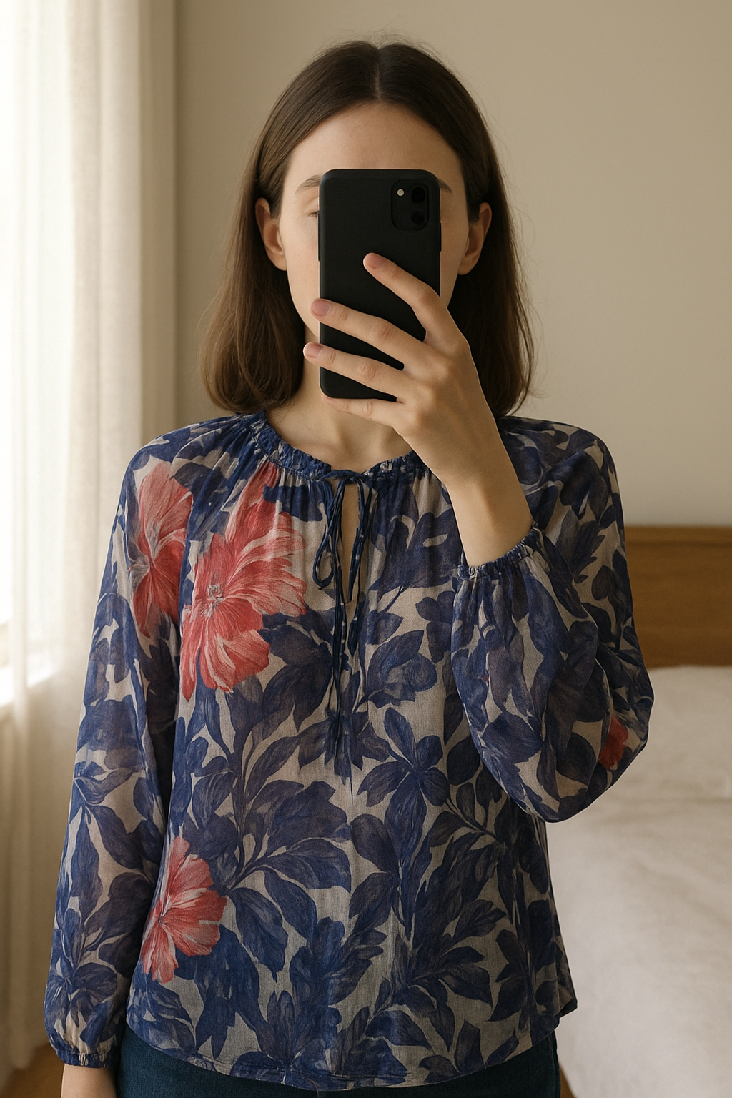 Chemiser transparent floral debout, face à la caméra, dans une chambre à la lumière douce, avec une lumière naturelle filtrant par la fenêtre.