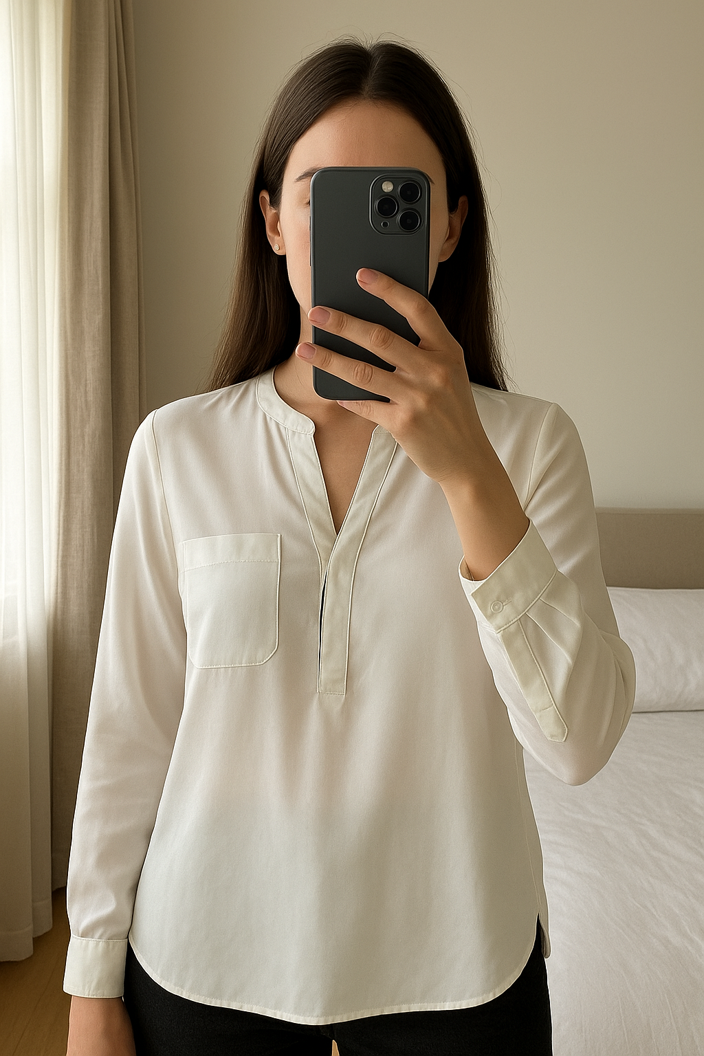 Chemisier blanc et noir debout, face à la caméra, dans une chambre à la lumière douce, avec une lumière naturelle filtrant par la fenêtre.