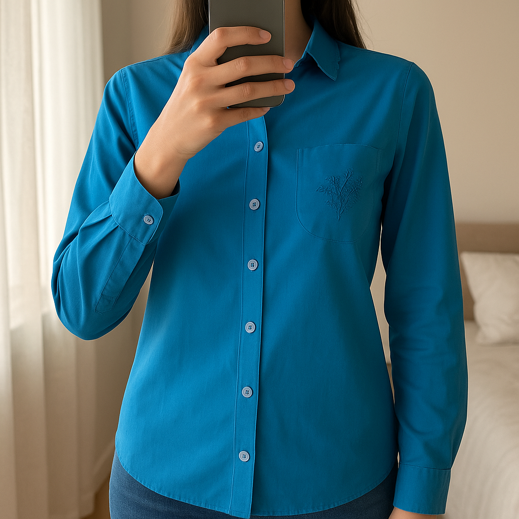 Chemisier bleu élégant Creation & Paris taille 38 manches longues debout, face à la caméra, dans une chambre à la lumière douce, avec une lumière naturelle filtrant par la fenêtre.