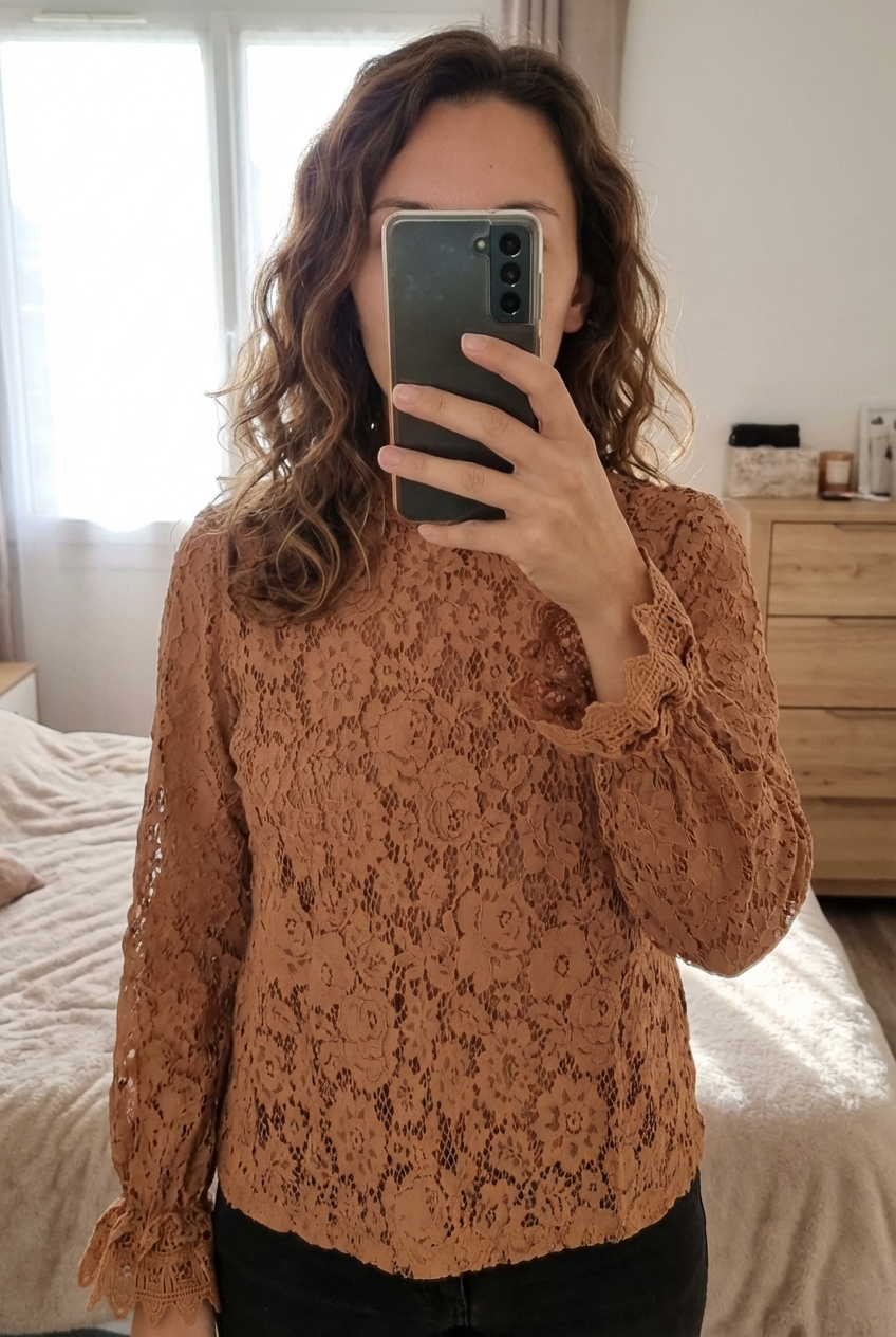 Une personne en Chemisier dentelle excellent état debout, face à la caméra, dans une chambre à la lumière douce, avec une lumière naturelle filtrant par la fenêtre.
