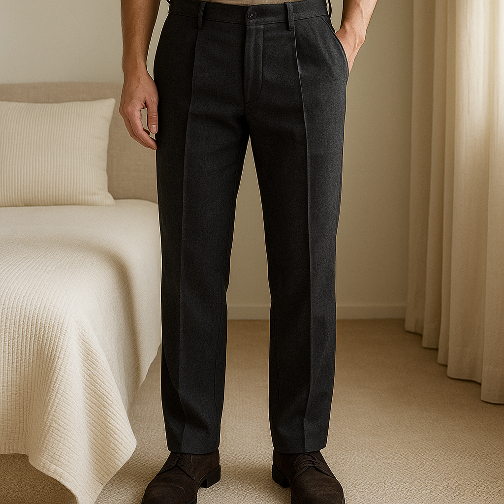 Chino celio taille 38 debout, face à la caméra, dans une chambre à la lumière douce, avec une lumière naturelle filtrant par la fenêtre.
