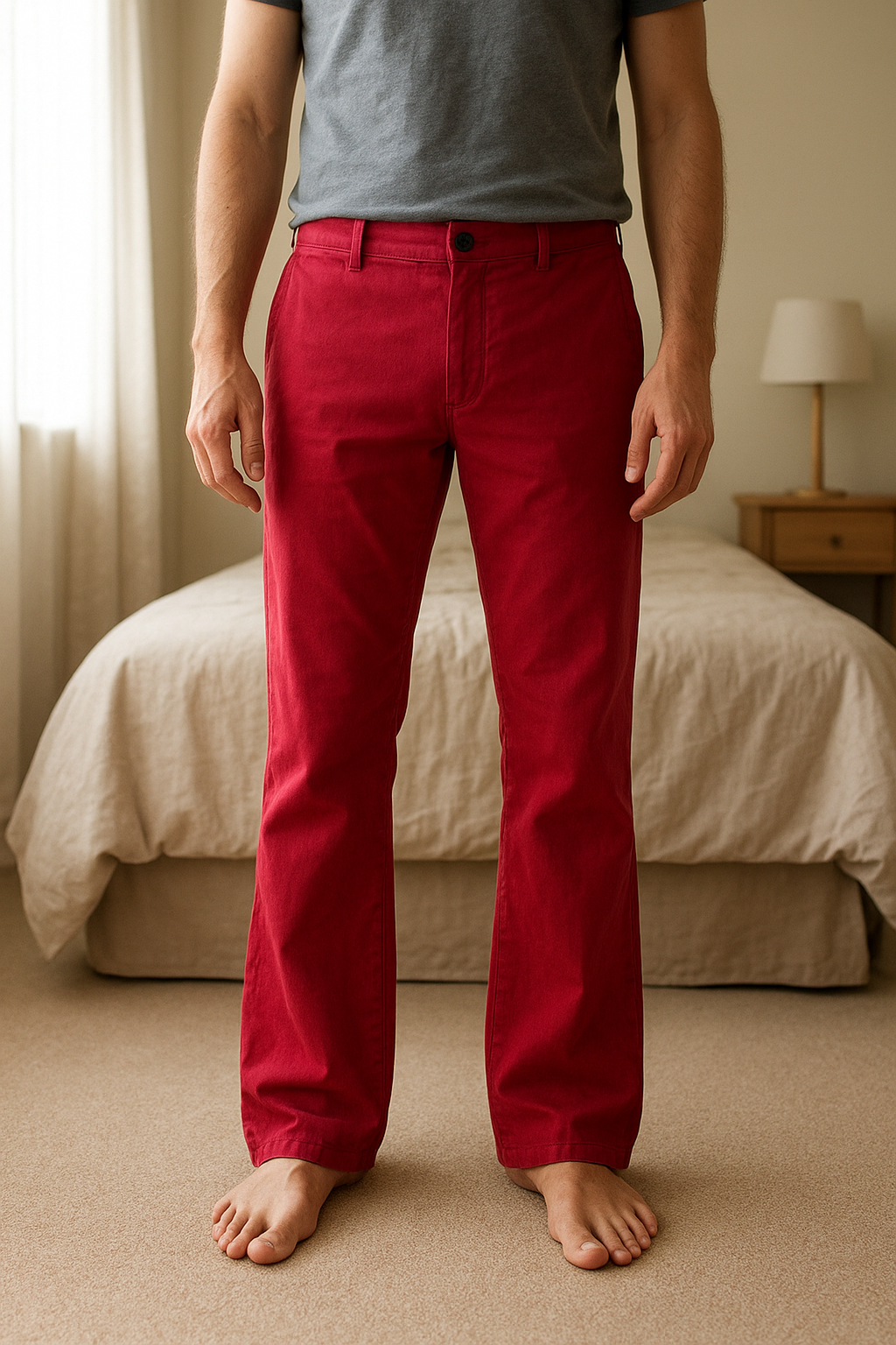 Chino rouge taille 42 debout, face à la caméra, dans une chambre à la lumière douce, avec une lumière naturelle filtrant par la fenêtre.