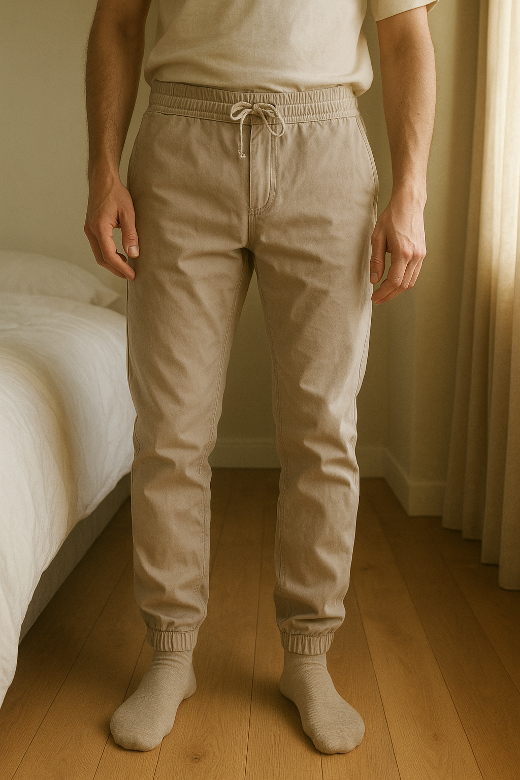 Chino Zara XL Neuf debout, face à la caméra, dans une chambre à la lumière douce, avec une lumière naturelle filtrant par la fenêtre.