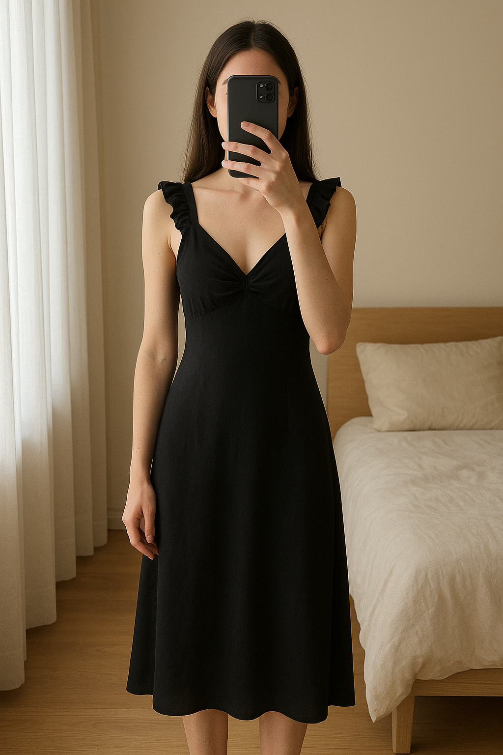 Cider Black Sleeveless Jumpsuit Size 26 standing straight facing the camera, in a softly lit bedroom setting, with gentle natural light filtering through a window.