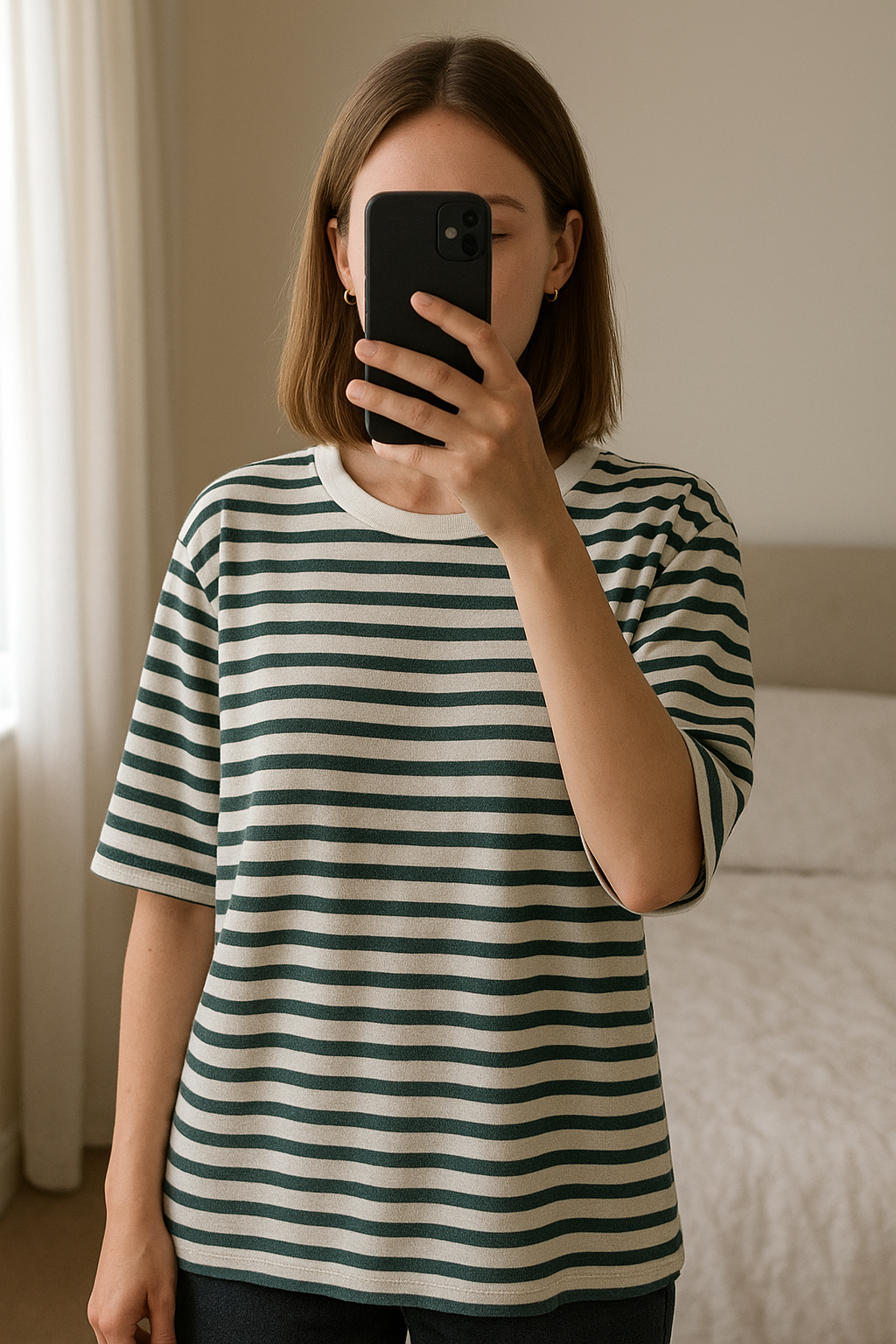 Cider Striped 3/4 Sleeve Top Size 4XL standing straight facing the camera, in a softly lit bedroom setting, with gentle natural light filtering through a window.