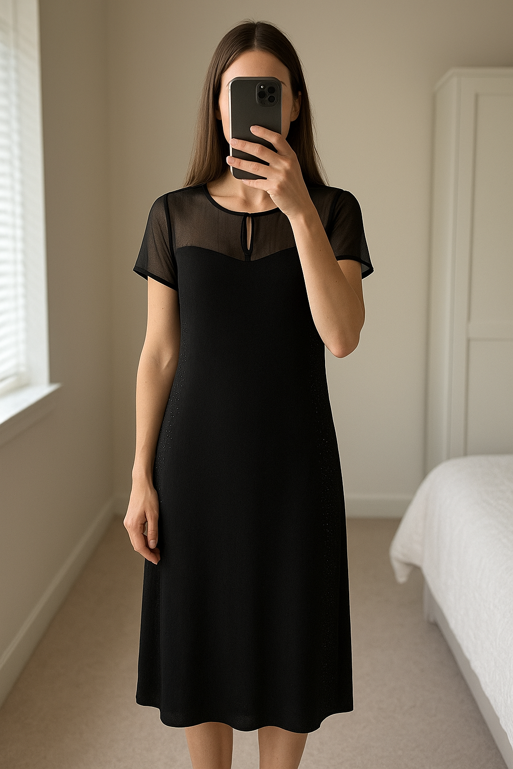 Coast black dress 10 standing straight facing the camera, in a softly lit bedroom setting, with gentle natural light filtering through a window.