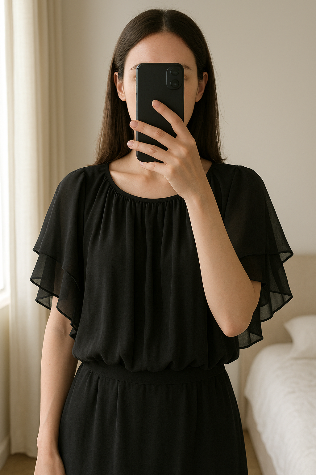 Coast black top / blouse- size 14 standing straight facing the camera, in a softly lit bedroom setting, with gentle natural light filtering through a window.