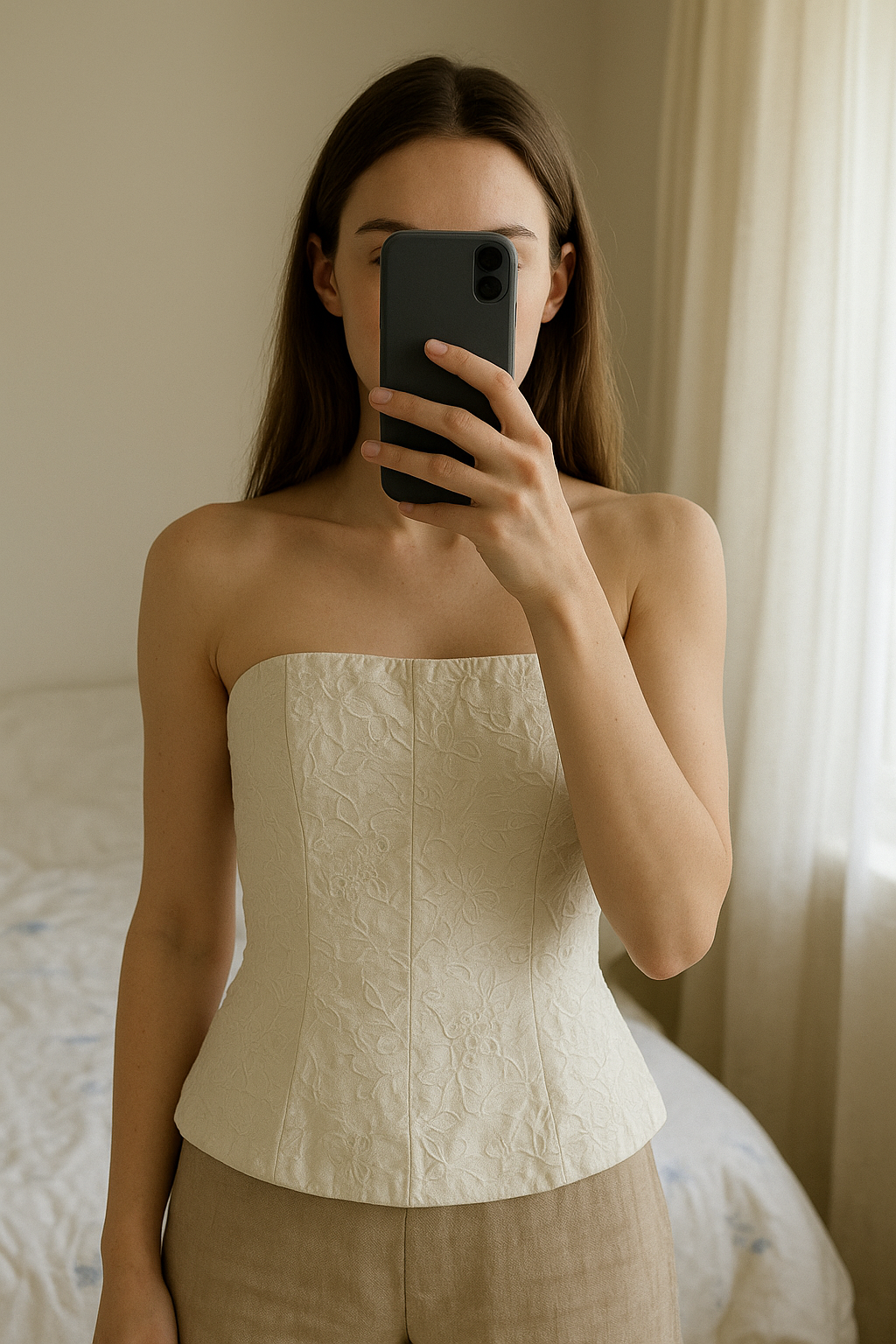Coast Corset Top standing straight facing the camera, in a softly lit bedroom setting, with gentle natural light filtering through a window.