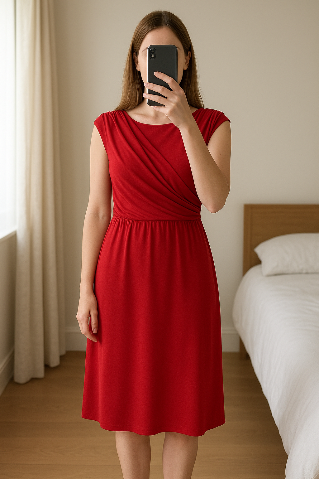 Coast Dress Orange Sleeveless Wrap Effect Stretchy Size 8 standing straight facing the camera, in a softly lit bedroom setting, with gentle natural light filtering through a window.