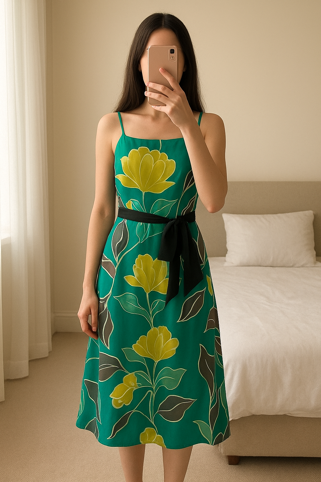 Coast strapless or spaghetti strap fitted dress standing straight facing the camera, in a softly lit bedroom setting, with gentle natural light filtering through a window.