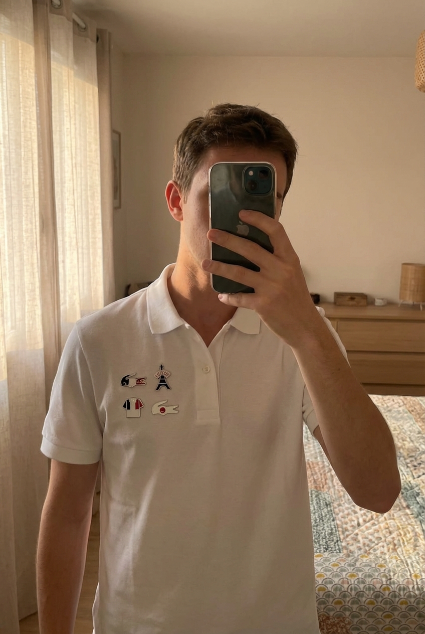 Coffret 4 Pin's Lacoste JO debout, face à la caméra, dans une chambre à la lumière douce, avec une lumière naturelle filtrant par la fenêtre.