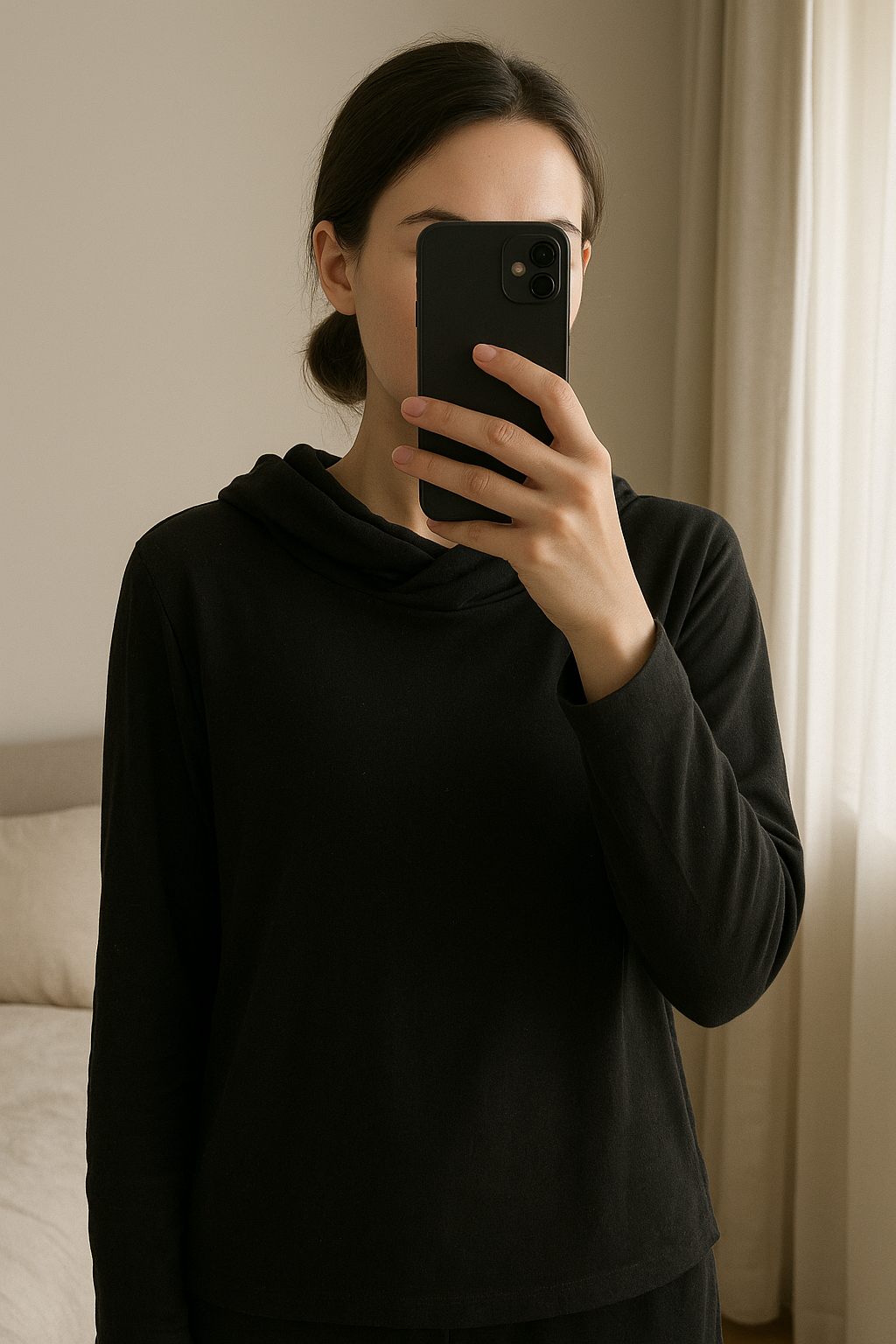 Col roulé taille 36 shein noir uni debout, face à la caméra, dans une chambre à la lumière douce, avec une lumière naturelle filtrant par la fenêtre.