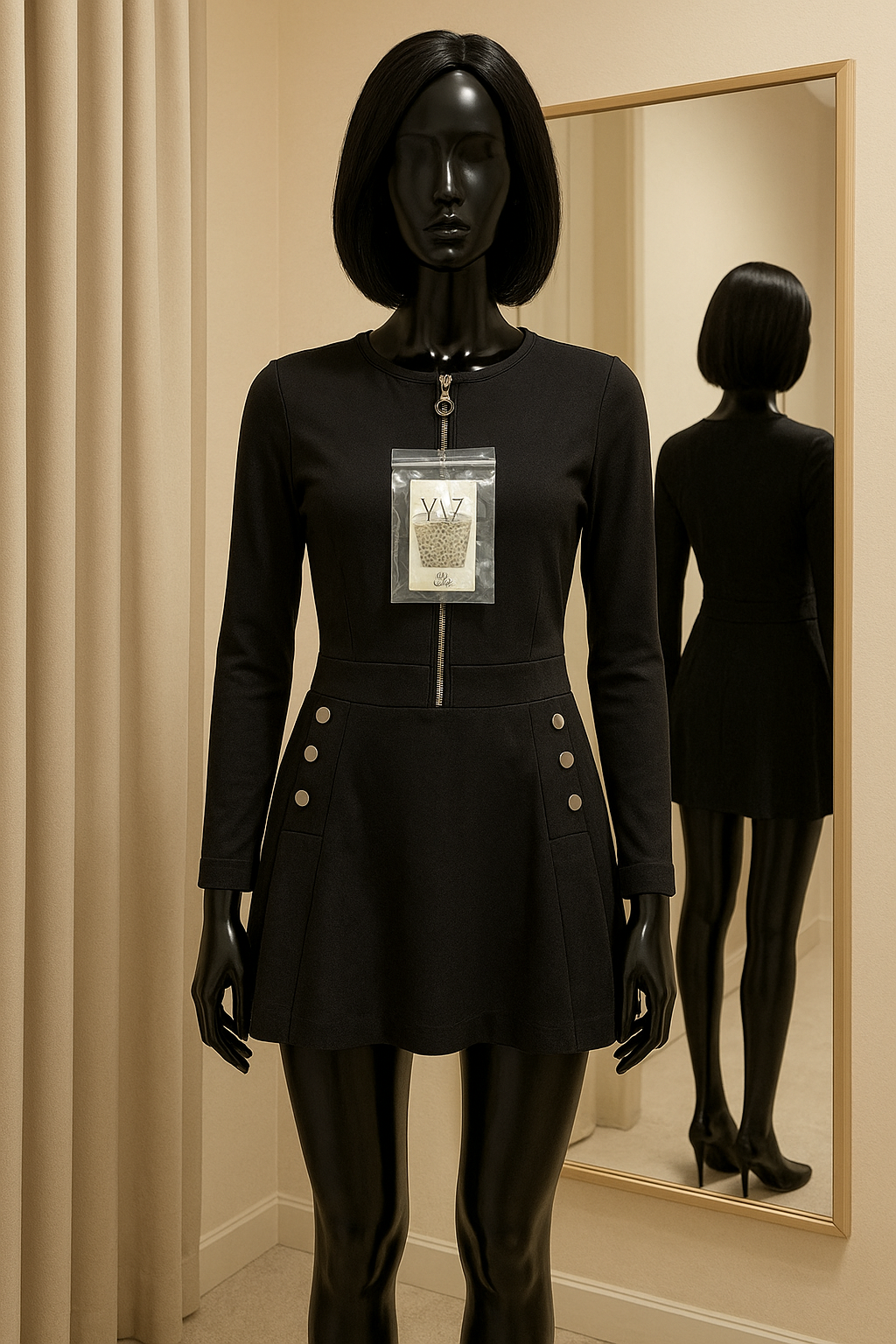 un mannequin noir brillant en plastique, sans traits du visage en Combi robe short ikks enfant fille taille 12 ans debout, face à la caméra, avec une silhouette fine, dans une cabine d’essayage de style boutique avec un miroir et une décoration neutre.