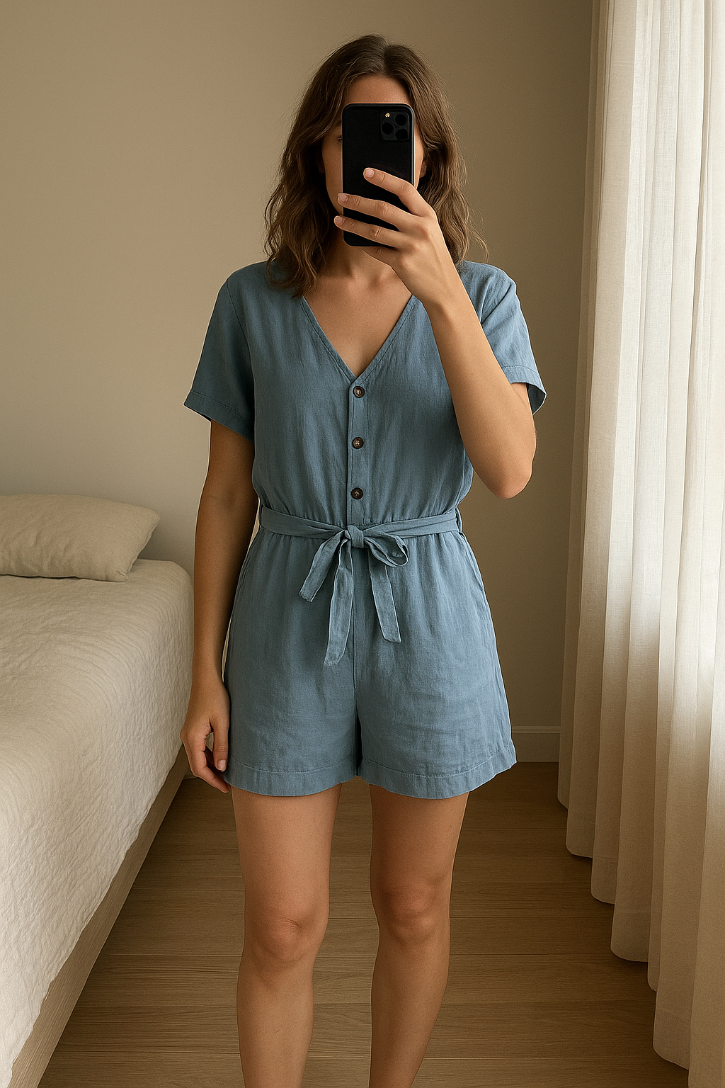 Combi-short ASOS debout, face à la caméra, dans une chambre à la lumière douce, avec une lumière naturelle filtrant par la fenêtre.
