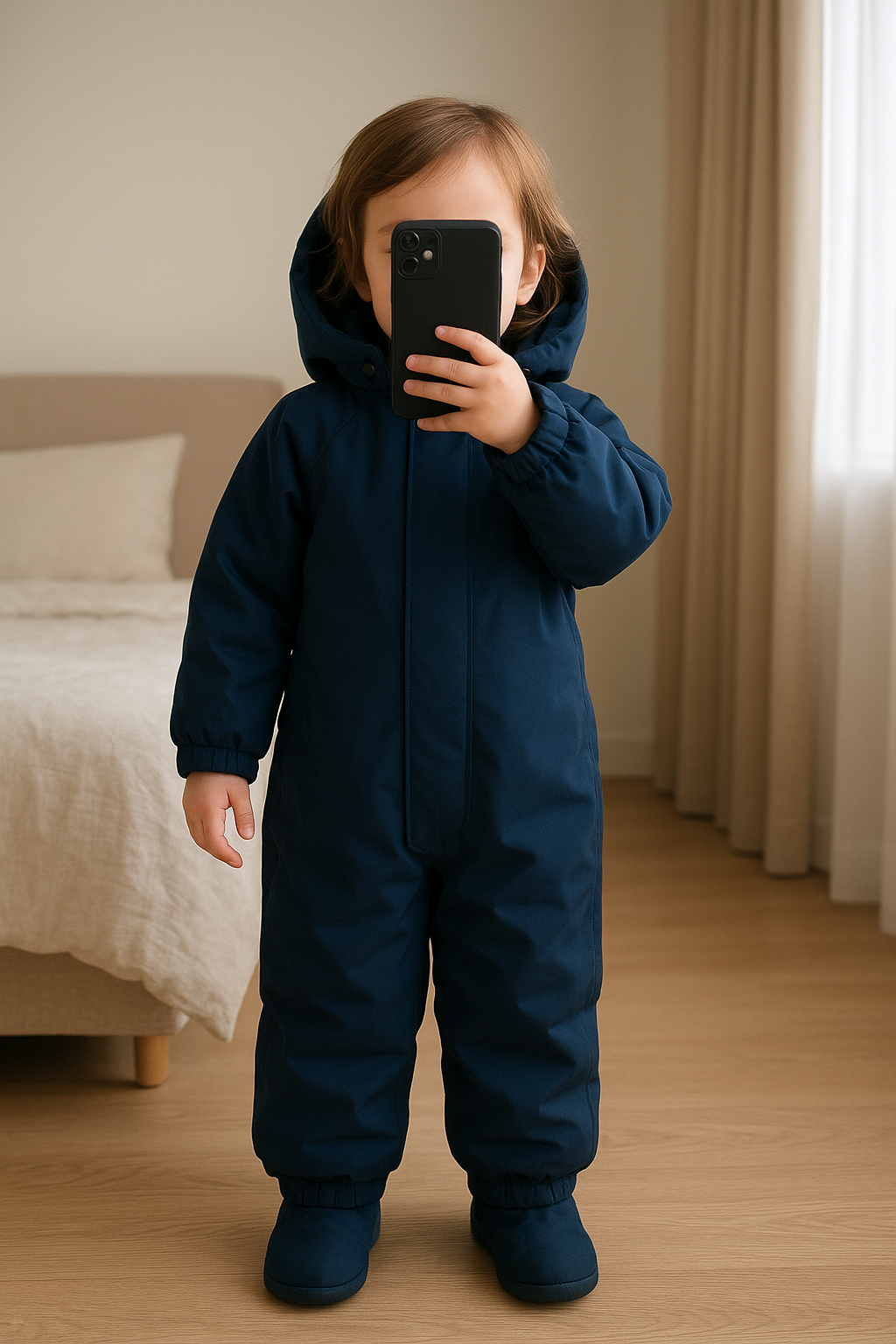 Combi ski 12m debout, face à la caméra, dans une chambre à la lumière douce, avec une lumière naturelle filtrant par la fenêtre.