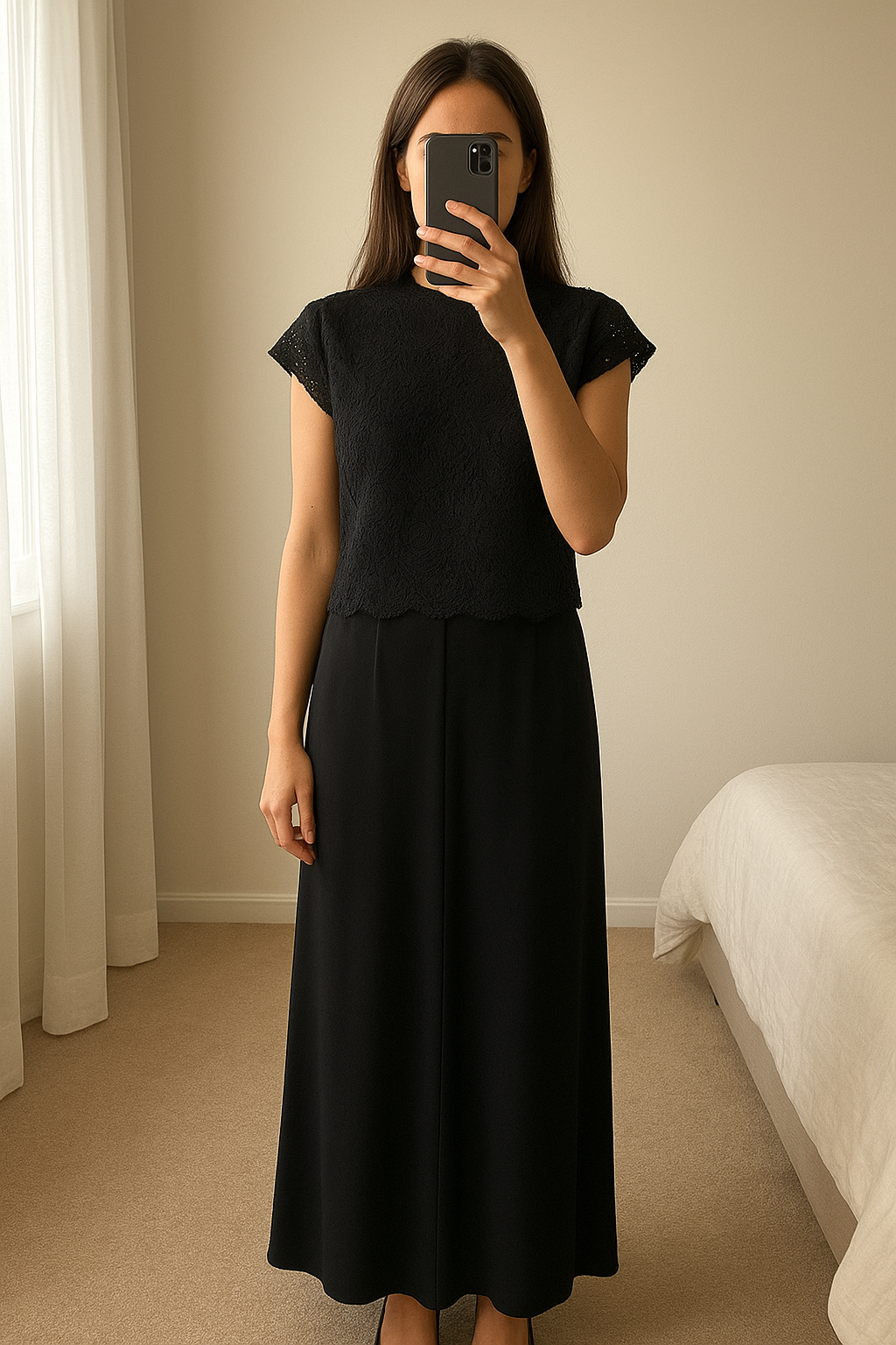Combinaison noire élégante – style patte d’éléphant debout, face à la caméra, dans une chambre à la lumière douce, avec une lumière naturelle filtrant par la fenêtre.