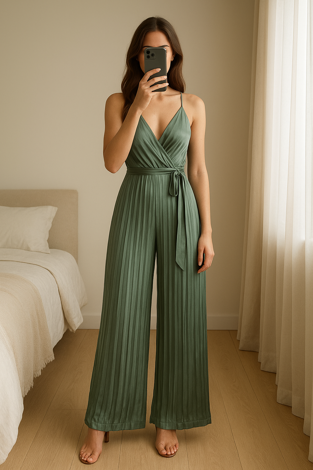 Combinaison satinée debout, face à la caméra, dans une chambre à la lumière douce, avec une lumière naturelle filtrant par la fenêtre.