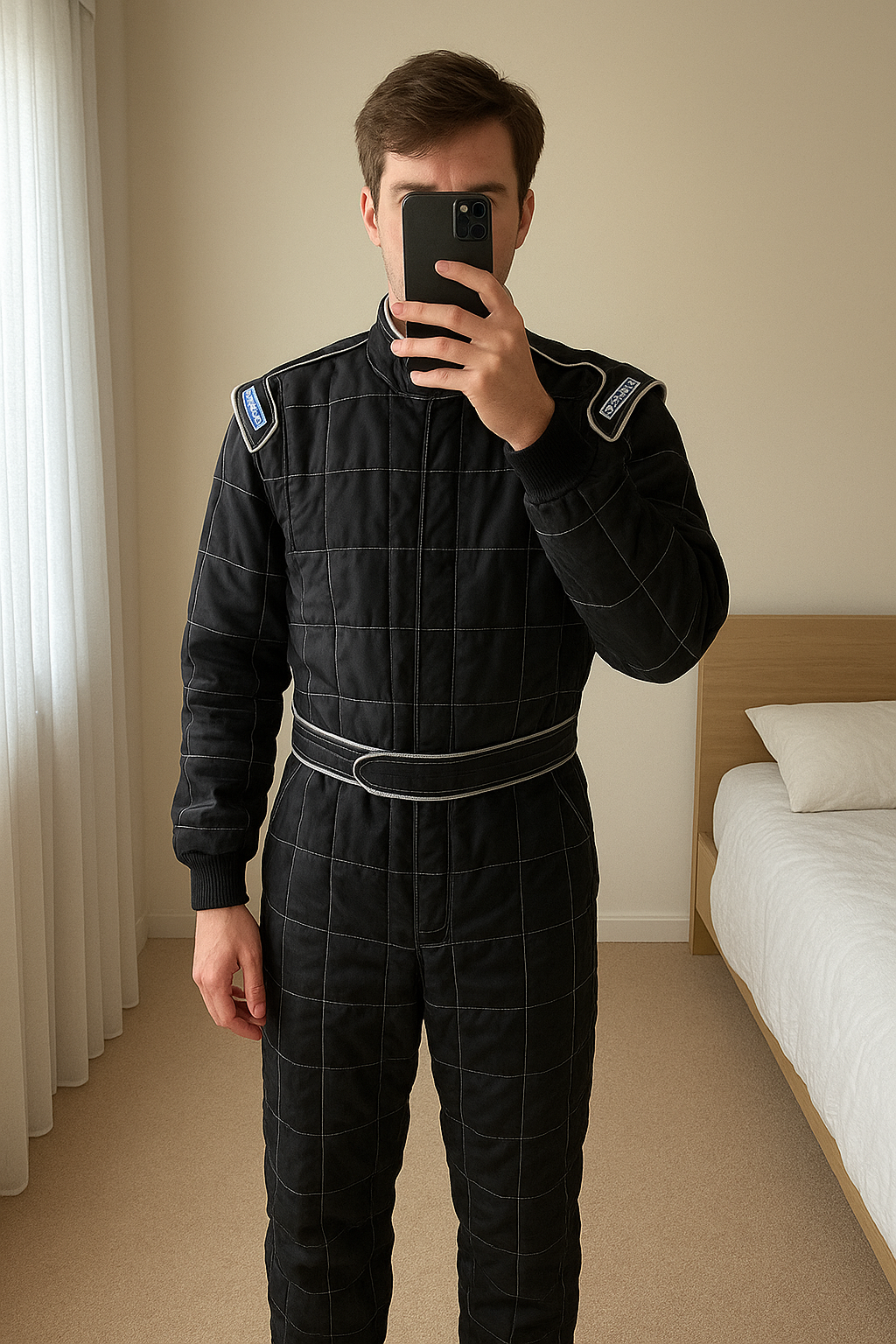Combinaison sparco xxl noire avec gants taille 11 debout, face à la caméra, dans une chambre à la lumière douce, avec une lumière naturelle filtrant par la fenêtre.
