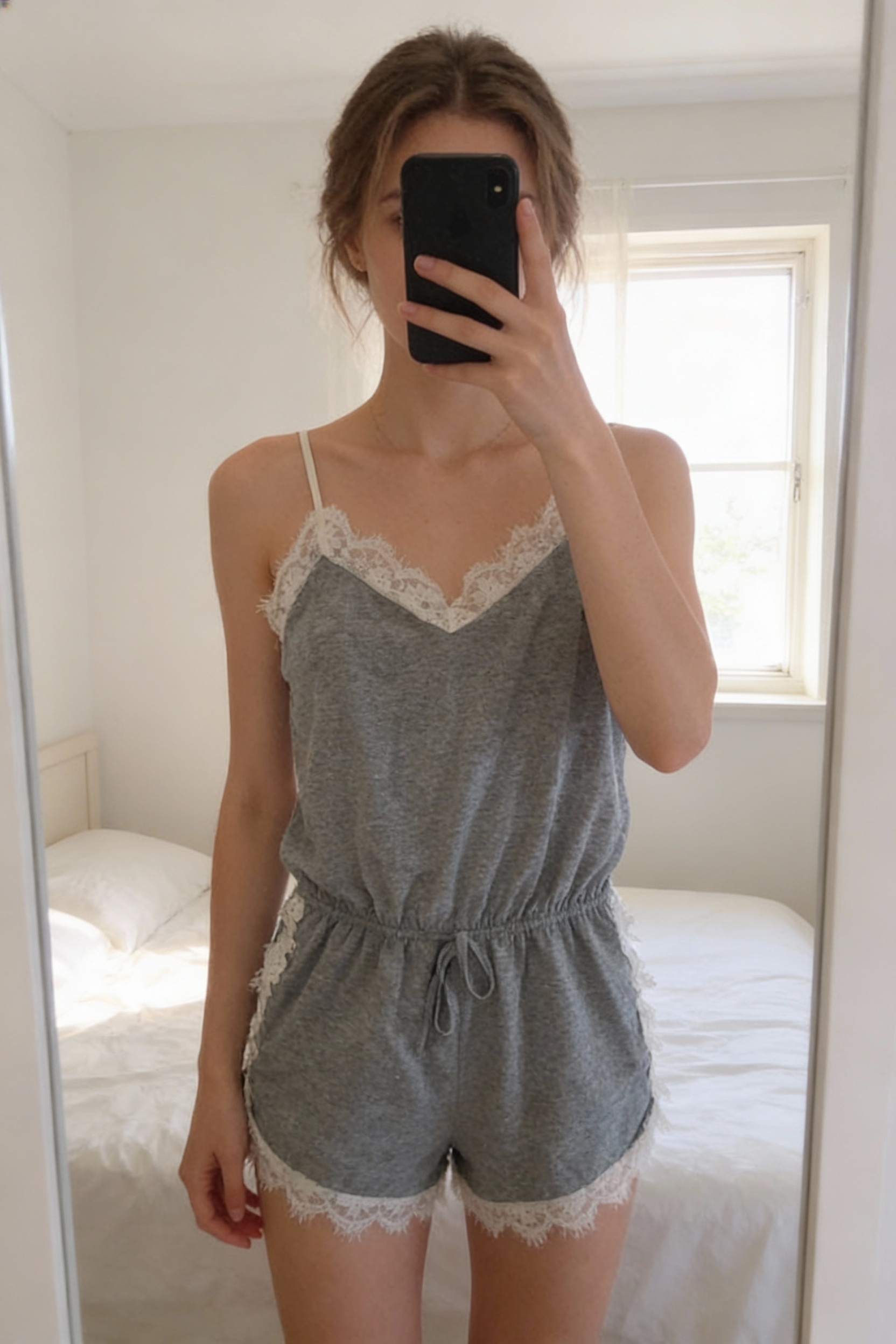 Combishort pyjama neuf S debout, face à la caméra, dans une chambre à la lumière douce, avec une lumière naturelle filtrant par la fenêtre.