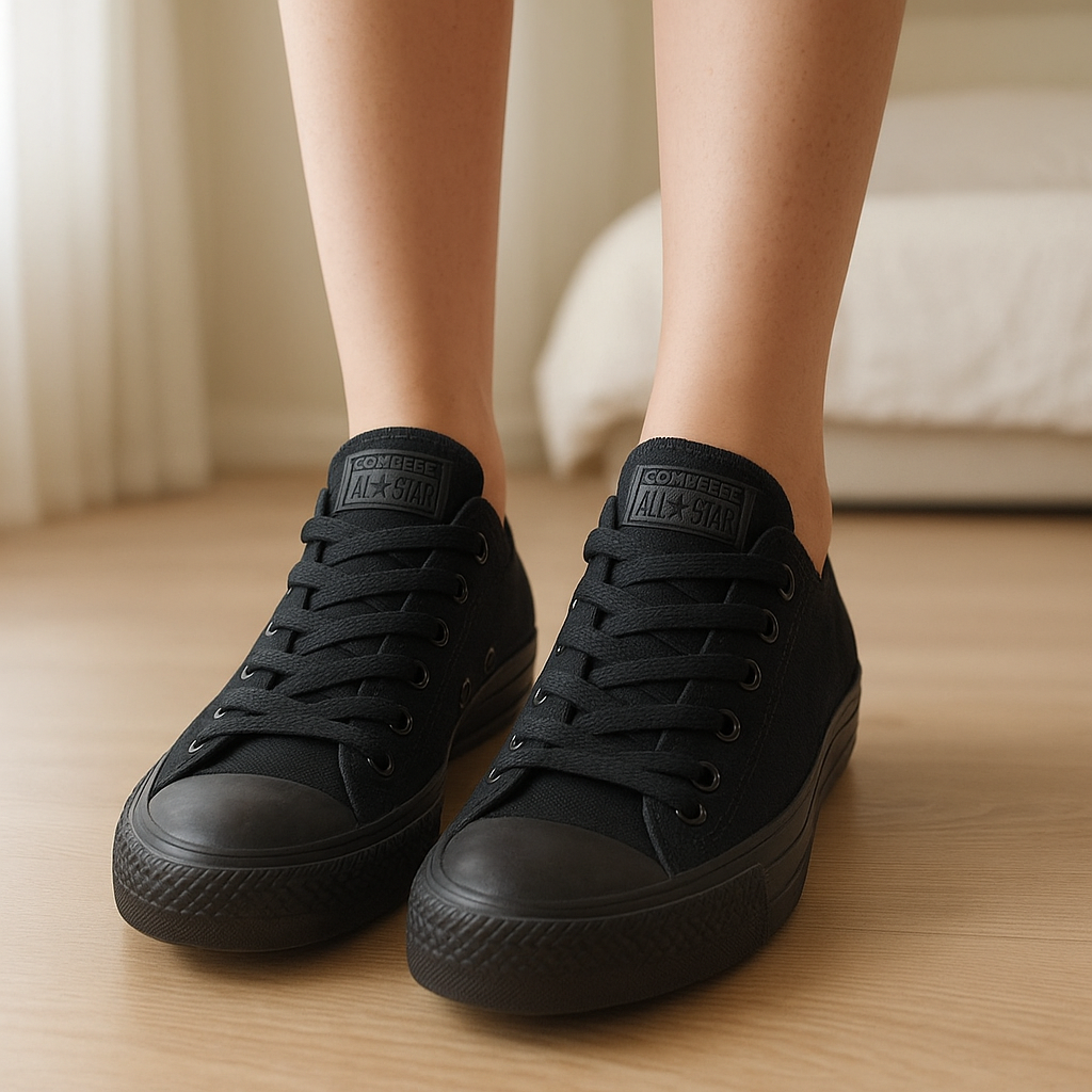 Une personne en Converse Chuck Taylor All Star basses noires – Taille 41 debout, face à la caméra, dans une chambre à la lumière douce, avec une lumière naturelle filtrant par la fenêtre.