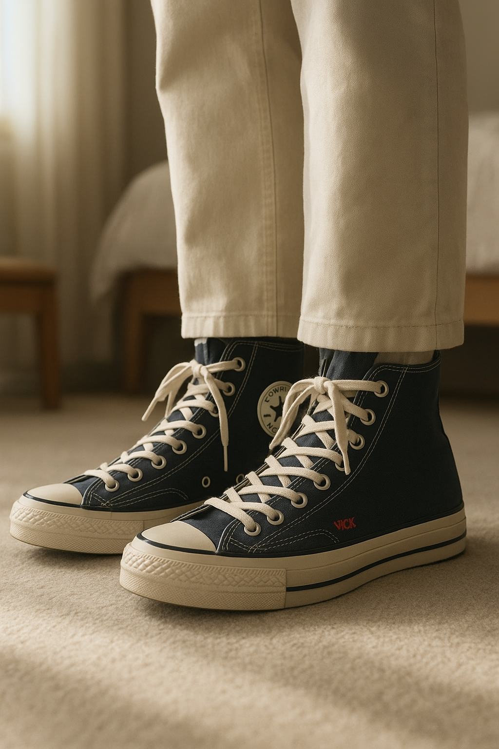 Converse X stranger things Chuck 70 debout, face à la caméra, dans une chambre à la lumière douce, avec une lumière naturelle filtrant par la fenêtre.