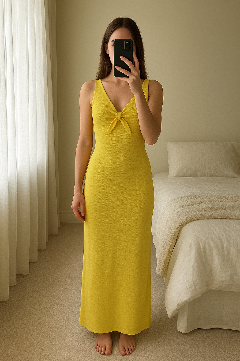 CoppeRose Paris Body Con Dress M/L standing straight facing the camera, in a softly lit bedroom setting, with gentle natural light filtering through a window.